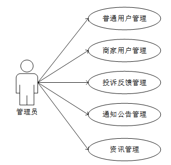 管理员通过登录功能步入到后台管理系统当中,普通用户管理功能可让管理员查看,更改以及删除普通用户的账户信息,商家用户管理功能可以让管理员能够对商家账户执行管理操作,从而保证商家信息的准确性,投诉反馈管理功能准许管理员查看用户所提交的投诉信息并予以处理,通知公告管理功能支持管理员发表,更改以及删除平台的通知与公告,资讯管理功能许可管理员管理商城的资讯内容。管理员功能用例图如图3-15所示。