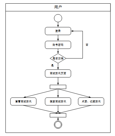 用户登录成功后,就可以浏览商城资讯,此时系统前端会显示商城资讯,同时也会对数据库进行查询,获取相关的资讯信息,用户可以选择查看商城资讯、搜寻商城资讯、点赞、收藏资讯,如果用户选择查看商城资讯,系统前端就会从数据库中获取相应的资讯信息并进行展示;如果用户选择搜寻商城资讯,系统前端就会根据用户所写的关键词进行搜索,并将搜索到的结果进行展示;如果用户选择点赞或收藏资讯,系统前端就会将用户的点赞或收藏操作提交给系统后端,系统后端将这些信息存入数据库,这样用户就可以结束浏览商城资讯的过程。用户浏览商城资讯活动图如图3-2所示。
