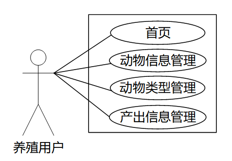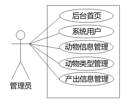 后台管理端的功能:后台管理模块功能主要分为:后台首页、系统用户(管理员、养殖用户)、动物信息管理、动物类型管理、产出信息管理等功能。