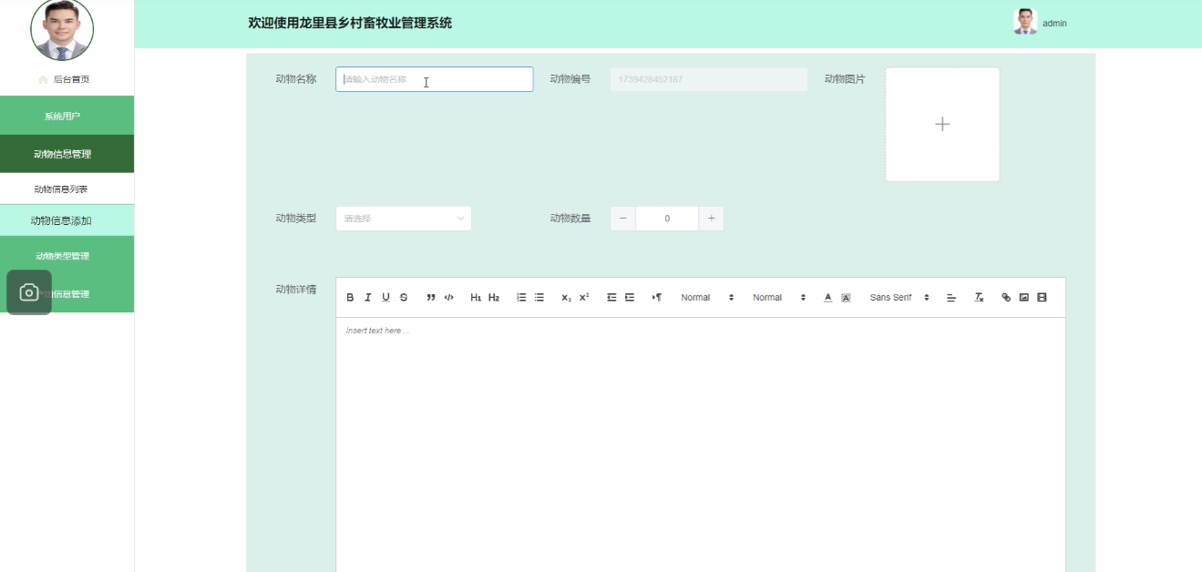 管理员可以对动物信息列表进行管理,输入动物类型、数量、图片、名称等信息添加新的动物信息。动物信息管理界面如下图所示。