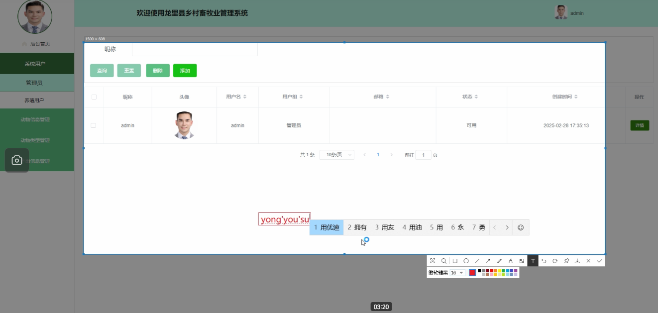 在用户页面中可以对管理员、养殖用户两种角色进行管控,还可以对三种角色进行查询、重置、添加和删除。用户界面如下图所示。