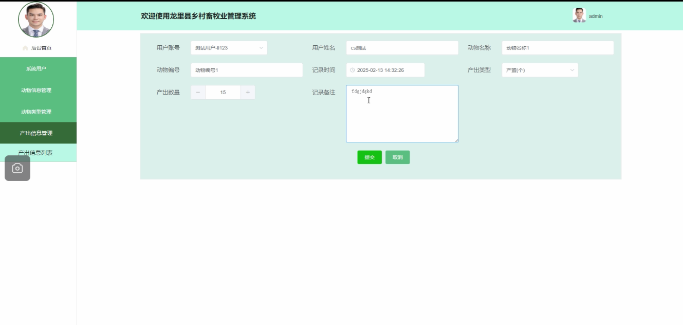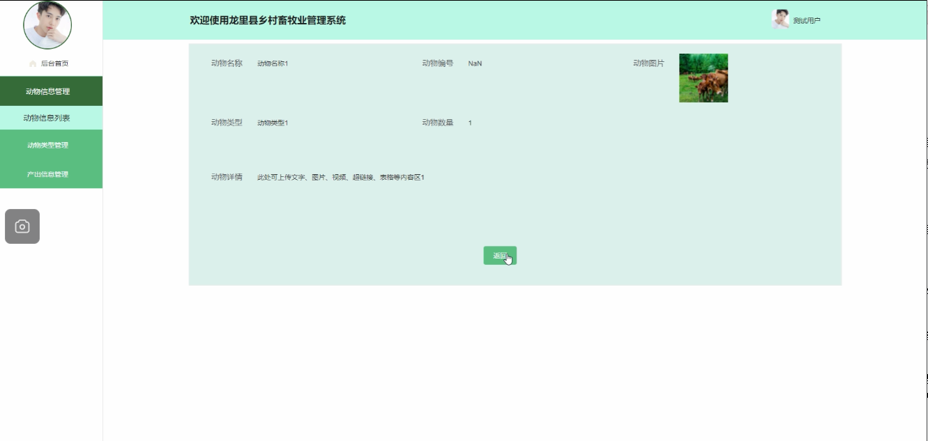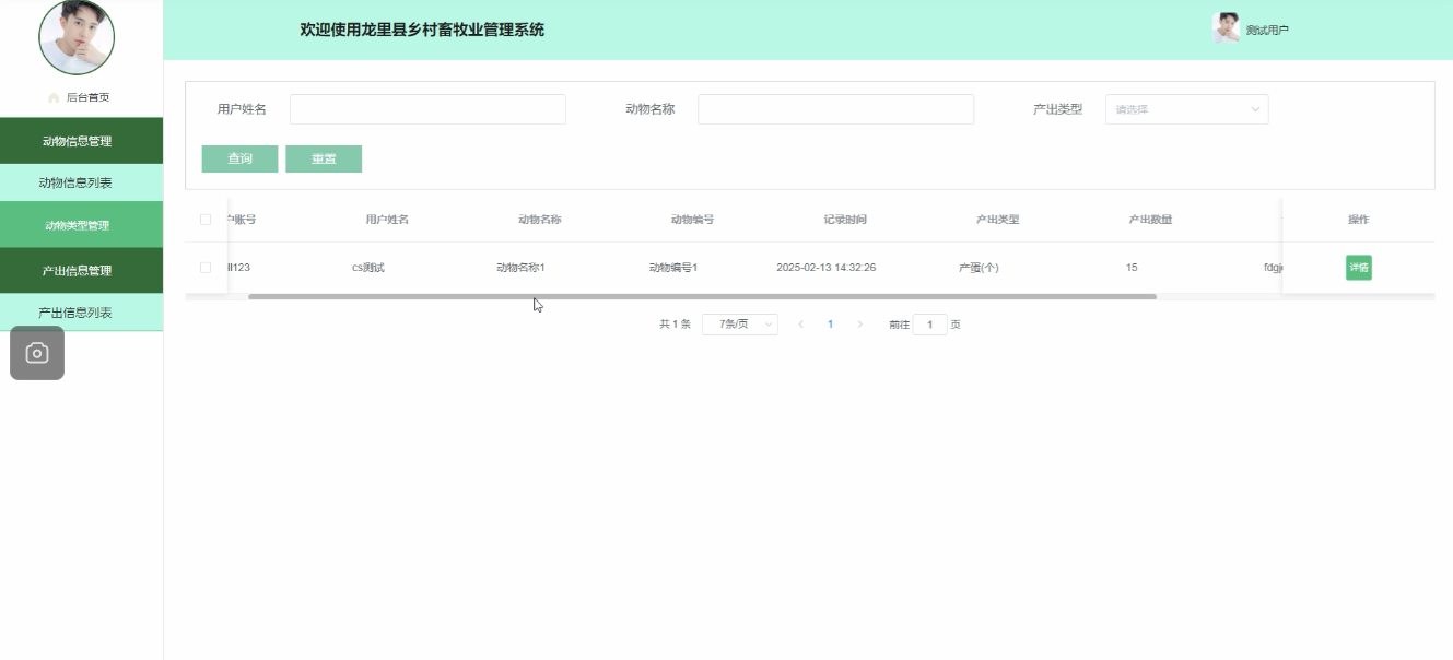 用户可以查看动物信息列表,详细查看动物名称、类型、数量等信息,并进行动物的产出记录。动物信息界面如下图所示。
