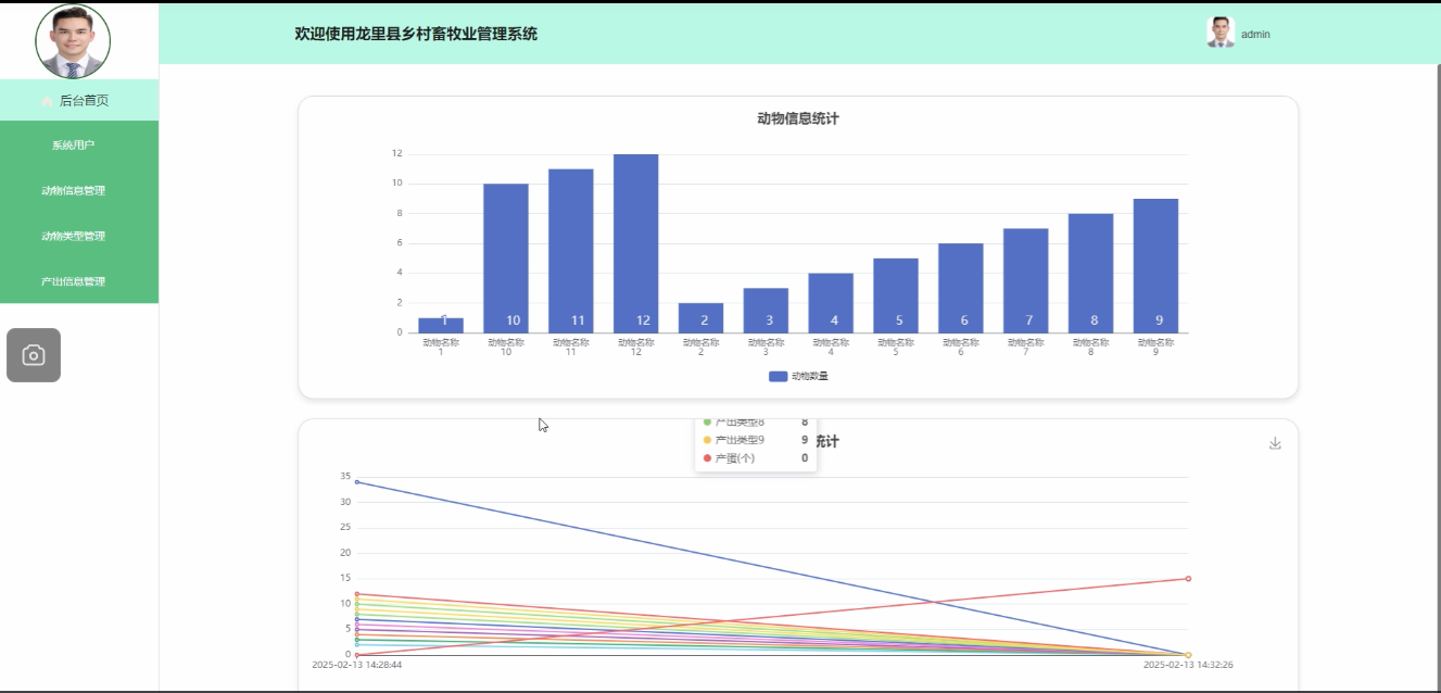 在管理员功能页面中可以查看后台首页、系统用户(管理员、养殖用户)、动物信息管理、动物类型管理、产出信息管理等功能。并可进行相应操作,查看动物信息、产出信息等的统计图,界面如下图所示。