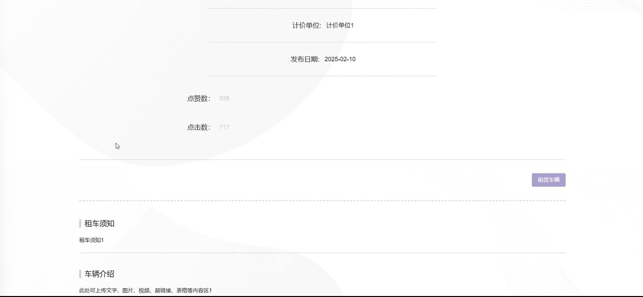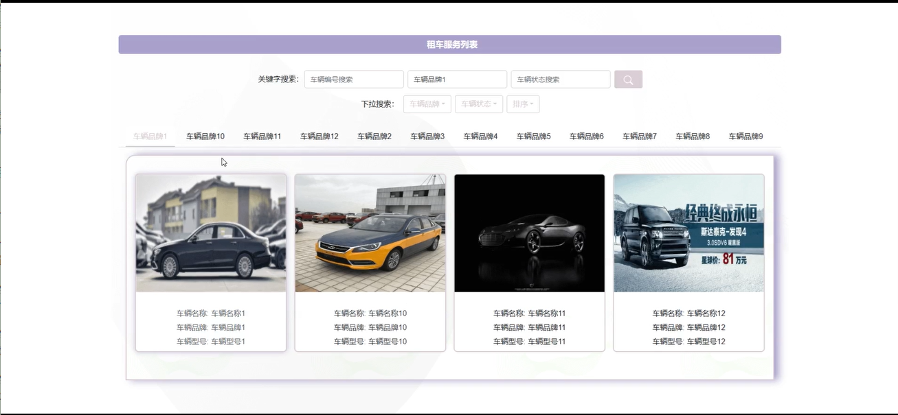 租车服务:在“租车服务”模块,注册用户可以查看详细的租车信息,包括车辆名称、品牌、型号、租车单价等。用户还可以通过输入车辆编号、品牌或状态等关键词进行筛选。用户还可以对喜欢的车辆进行点赞、收藏、评论,并进行租赁操作。