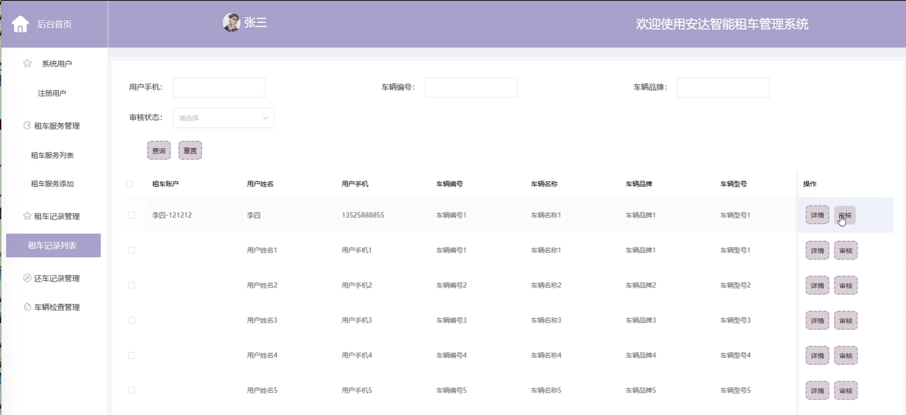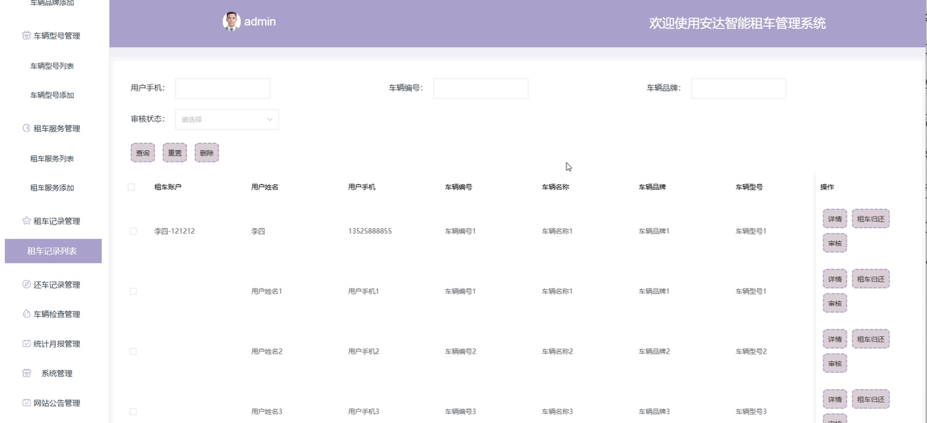 :员工用户可以查看用户的租车记录,并进行审核操作。员工可以通过手机、车辆编号、品牌等信息查询租车记录,必要时可以进行修改和重置。租车记录管理界面如下图所示。