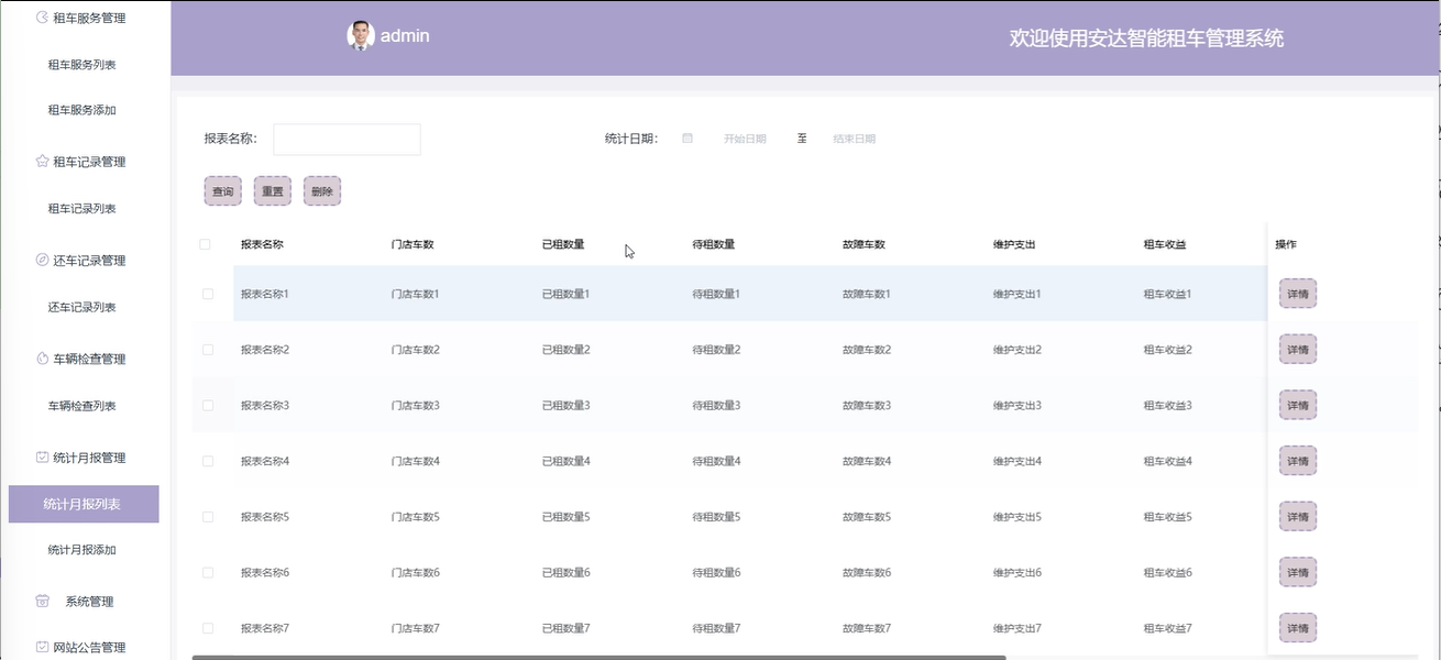 统计月报管理:管理员可以查看并生成每月的租车统计报表。管理员可以输入统计日期范围和报表名称,查看包括门店车数、已租数量、待租数量、故障车数、维护支出等数据,并添加新的统计报表。