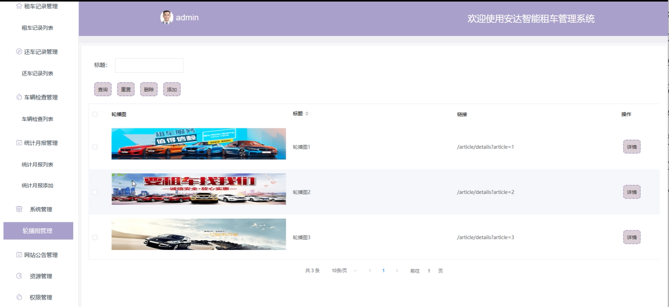 管理员可以管理轮播图和网站公告,确保用户界面上的信息及时更新。管理员可以查看、修改和删除公告以及轮播图,并能够添加新的内容,如链接、标题等。轮播图界面如下图所示。