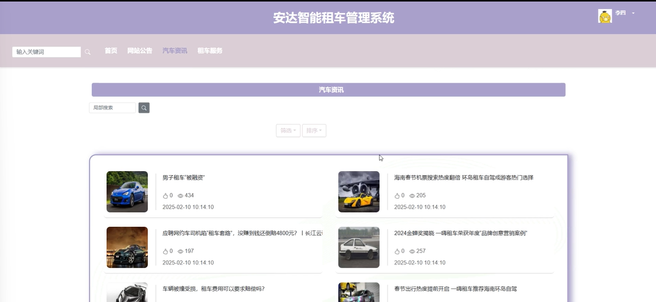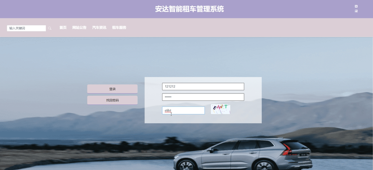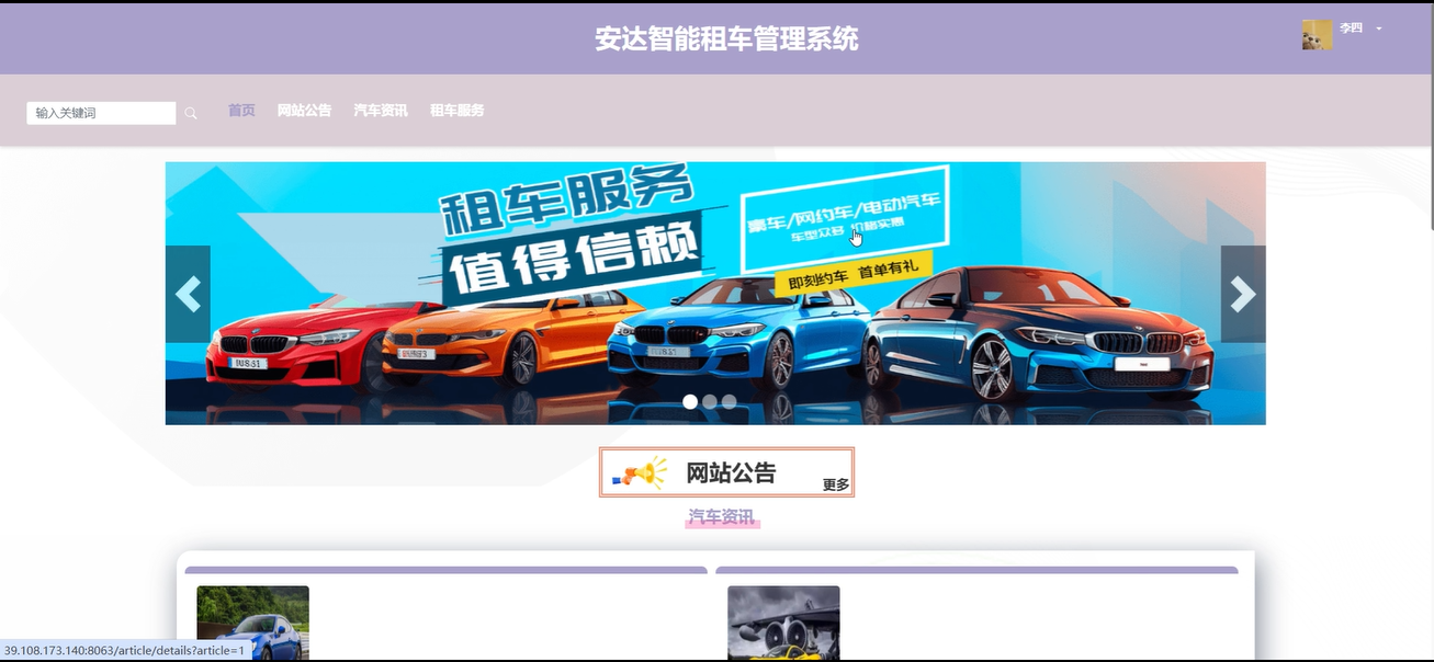 首页:注册用户登录系统后进入首页,首页提供导航栏功能,用户可查看轮播图、网站公告、汽车资讯、租车服务推荐等内容。用户还可以通过关键词搜索,快速查找相关信息。