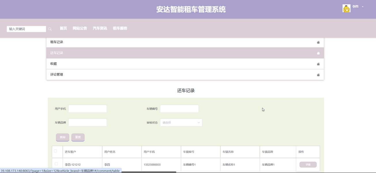还车记录:用户可以查看自己的还车记录,并通过手机、车辆编号、品牌等信息进行查询。