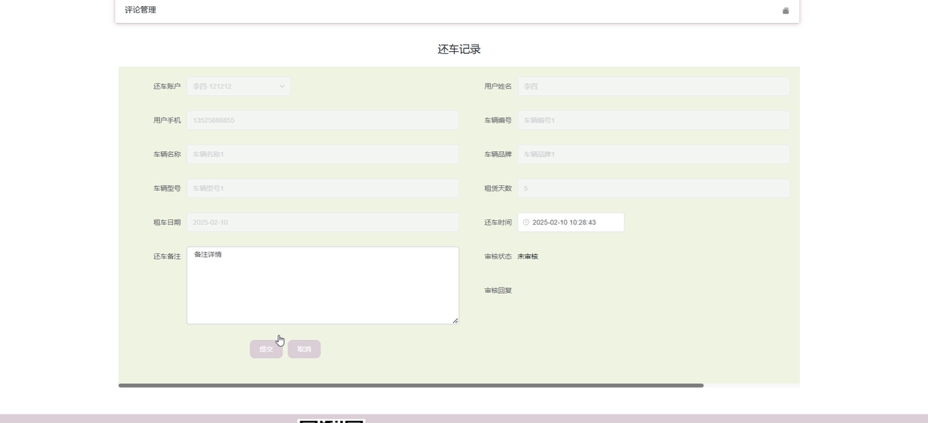 员工可以管理用户的还车记录,并对还车记录进行审核,确保登记信息的准确性。员工还可以通过手机、车辆编号等信息进行查询、修改或删除操作。还车记录界面如下图所示。