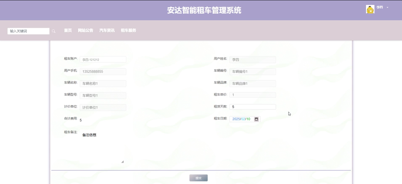| 租赁车辆提交功能测试 | 提交成功的情况 | 用户在“租赁车辆”菜单可以进行租赁提交,提交租赁内容信息。 | 完成 | 正确 |