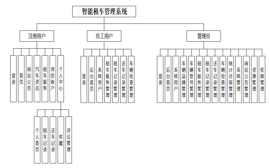 通过上一章节的功能需求分析,可以得出本智能租车管理系统的功能结构图,