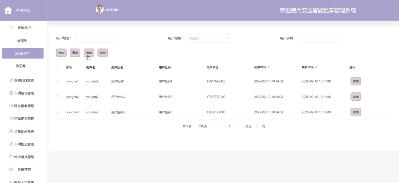 系统用户管理:员工用户可以管理注册用户的账号,包括通过用户姓名、手机、性别等信息进行搜索,进行重置、删除操作。此外,员工还可以添加新的注册用户到系统中。