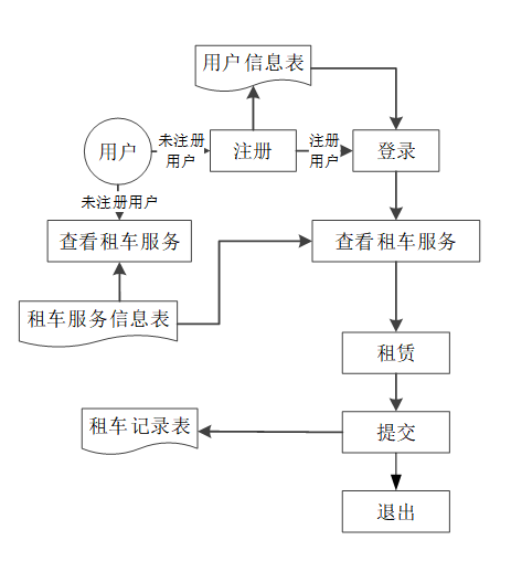 (3)确定好系统使用的技术,进行在线确认系统所划分的用户角色,并且根据用户角色划分确定所要设计的功能模块,对智能租车管理系统的设计主要划分用户角色,并所使用的功能模块也相应不同,但是系统的数据库实现的内容是交互的,用户可以随时根据自己的需求进行信息查看,对于系统工作人员可以根据自己的分管内容进行在线信息的处理及操作。