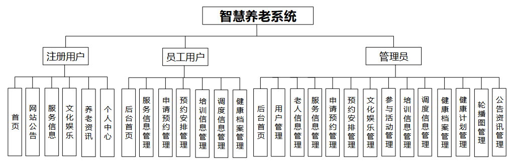 系统主要分为三大用户角色:注册用户、员工用户和管理员。注册用户可通过平台申请家政、医疗、陪护等服务,报名参与文化娱乐活动,并管理个人健康档案与预约记录。员工用户则负责管理服务信息、处理预约申请、安排服务调度,并跟踪老人的健康状况。管理员则全面管理用户数据、审核预约、优化资源调度,并发布公告与文化活动信息。