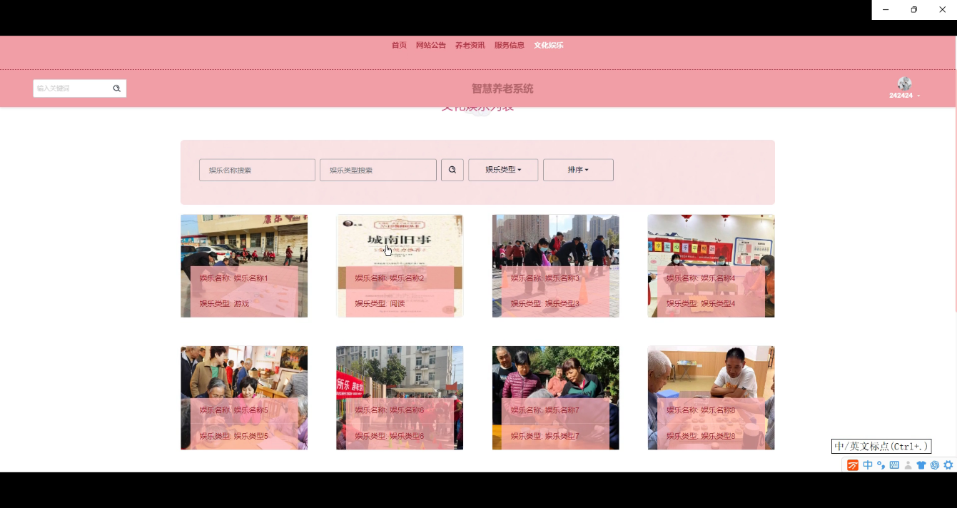 “文化娱乐”模块提供丰富的活动选项,如健身课程、兴趣班、文娱活动等,供老年人参与。注册用户可以通过此模块查看活动详情,在线报名参加,系统会自动更新活动安排并提供通知提醒,帮助老年人充分利用闲暇时间,提升生活质量。界面图如下所示。
