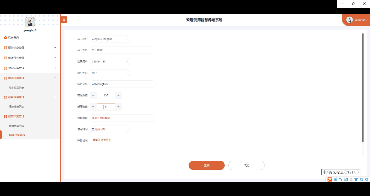 员工用户通过“健康档案管理”模块,可以更新和维护老年人的健康数据,包括病史、体检报告、药物使用等。此功能帮助员工实时跟踪老年人健康状况,确保所有健康数据得到准确记录,并为个性化健康服务提供数据支持。员工可根据健康档案为老年人制定相应的健康管理计划,提供更精准的服务。界面如下所示。