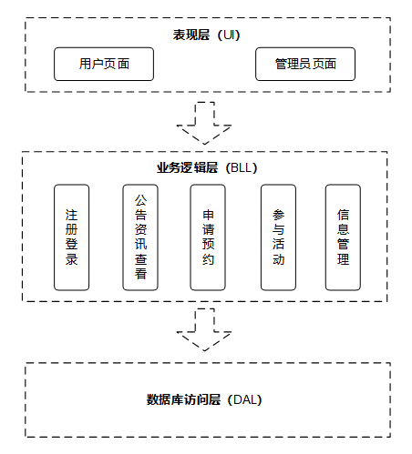 系统采用三层架构设计,分别为表示层、业务逻辑层和数据层。表示层使用Vue.js框架构建用户界面,负责与用户交互并展示数据;业务逻辑层通过Flask框架处理前端请求,执行数据处理与业务逻辑,并提供API接口;数据层使用MySQL数据库存储和管理用户数据、服务记录等,确保数据的持久化和高效访问。该架构确保了系统的高效性、可扩展性和可维护性,有利于后期功能的扩展与优化。整个系统架构如图4-1所示。