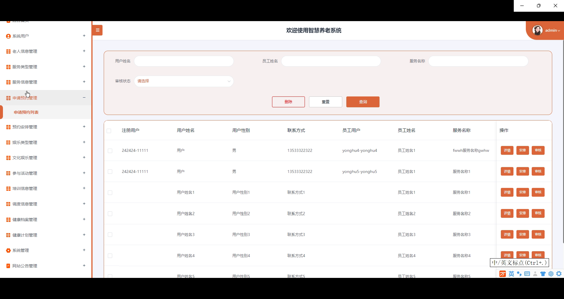 管理员在“申请预约管理”模块中,负责审核用户的预约申请。管理员会检查每个预约请求的合理性,确保服务时间、提供商和老人的需求匹配。当申请符合标准时,管理员将批准预约;若不符合要求,则会退回并要求修改。此功能确保服务的准确性与高效性。界面如下所示。