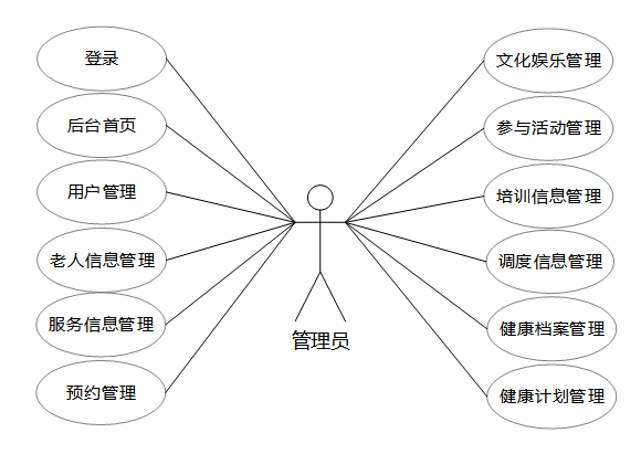 管理员可通过后台首页查看用户统计、日程安排,全面管理用户、老人信息及服务内容。审核并安排预约服务,维护文化娱乐活动,优化调度管理。培训信息管理提升员工能力,健康档案与健康计划确保老人得到精准健康管理,公告资讯管理提供最新政策和平台动态,保障系统高效运行。管理员角色用例如下图所示。