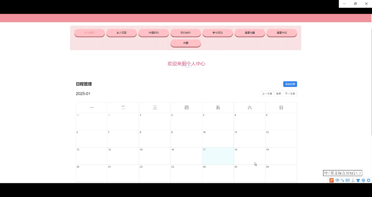 个人中心是注册用户访问和管理自己信息的入口,包括个人首页展示老年人的日程安排、健康档案等。用户可以通过首页方便地查看自己的每日安排、活动计划和健康信息,便于管理个人事务,提高生活自理能力。界面图如下所示。