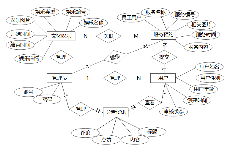 E-R图有助于理清系统中的数据结构和关系,为后续的数据库表结构设计提供指导。在进行数据库设计之前,先绘制实体-关系(E-R)图。E-R图将帮助理清业务中的实体(Entity)及它们之间的关系(Relationship),从而为后续的数据库表设计提供基础。根据前文可以得出本系统拥有多个实体,在此列举主要实体,各个实体之间联系总E-R图如下图所示。
