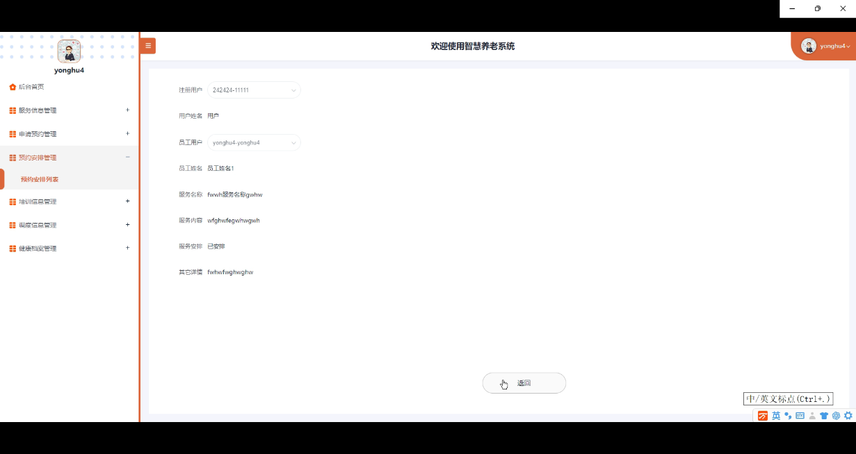 In terms of technical solutions, the system is developed in Python language, with a backend built on Flask framework and a user interaction interface implemented on the frontend using Vue.js framework. Data storage is done using MySQL database. This technical solution ensures that the system is efficient, stable, and has good scalability. Through the efficient management function of the platform, the system can improve the quality and user experience of elderly care services, ensuring the rational allocation and scheduling of resources. It is expected that through the use of the system, elderly people and their families can enjoy more convenient and high-quality services, while the work efficiency and service quality of employees will also be effectively improved.