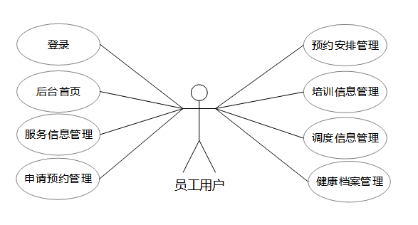 员工可通过后台首页查看每日工作日程,管理服务信息、预约申请,并合理安排预约服务。培训信息管理确保技能提升,调度管理优化工作安排,健康档案管理帮助跟踪老人的健康状况,提升服务质量,确保养老服务高效、有序进行。员工用户角色用例如下图所示。