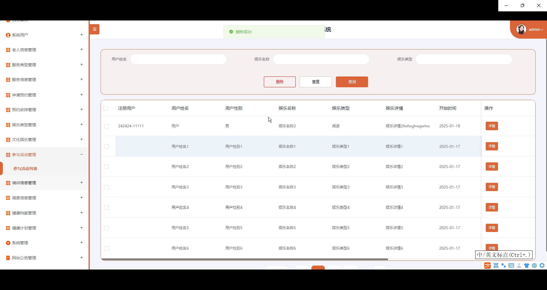 管理员可在“参与活动管理”模块中查看和管理老年人报名参加的各类活动。管理员能够处理报名信息、调整活动安排、确认参与者等。此功能确保活动顺利进行,及时为老年人提供活动信息和参与机会,并通过后台数据分析活动效果,改进后续安排。界面如下所示。