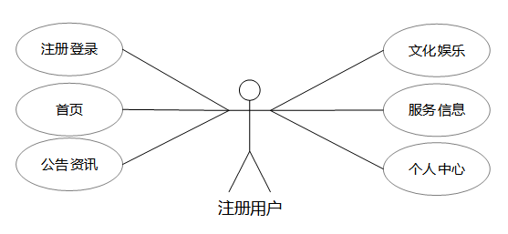 注册用户可通过首页快捷入口访问各项服务,及时查看平台公告及养老资讯,了解行业动态。可在线申请预约家政、医疗、陪护等养老服务,并报名参与文化娱乐活动,丰富生活。个人中心提供健康档案、预约记录及日程管理,帮助用户规划生活,确保服务便捷、高效。注册用户角色用例如下图所示。