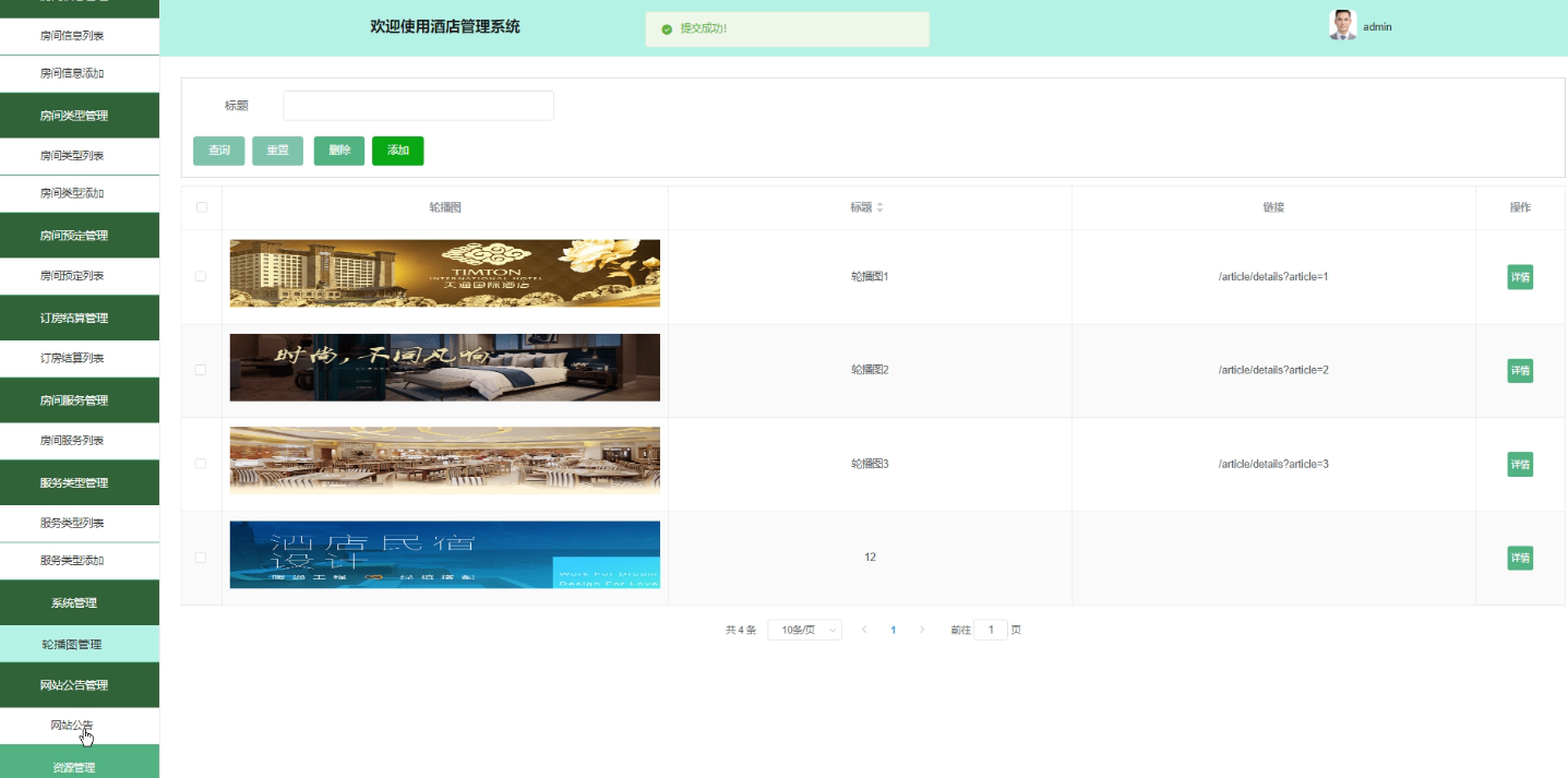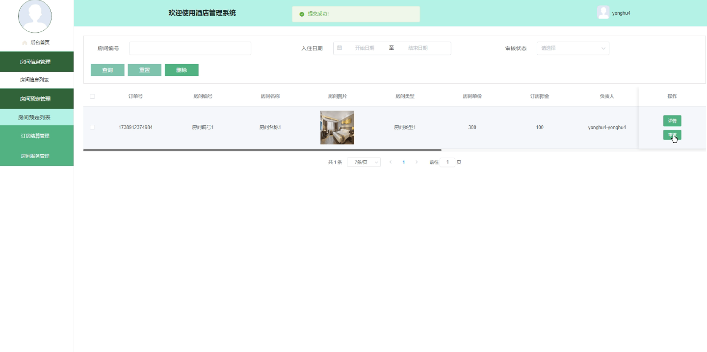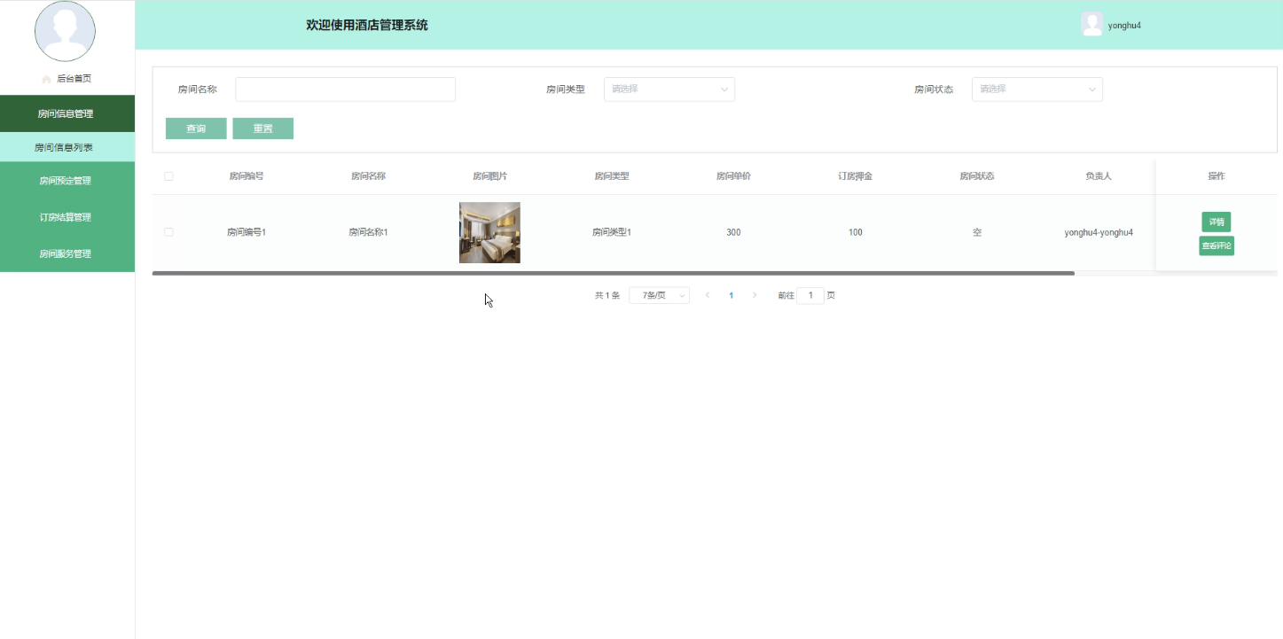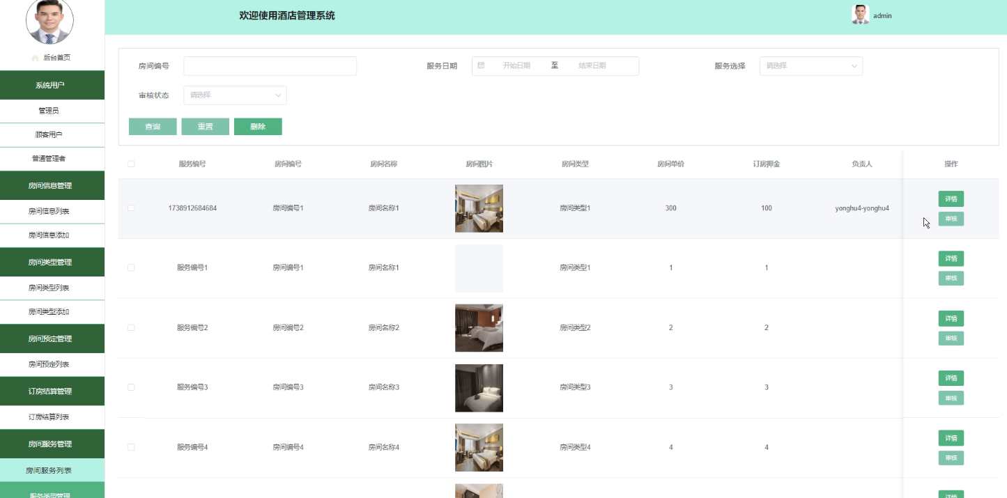 - 房间服务管理:允许管理员对房间服务进行删除查询操作,查看服务详情,并进行审核,确保服务质量。