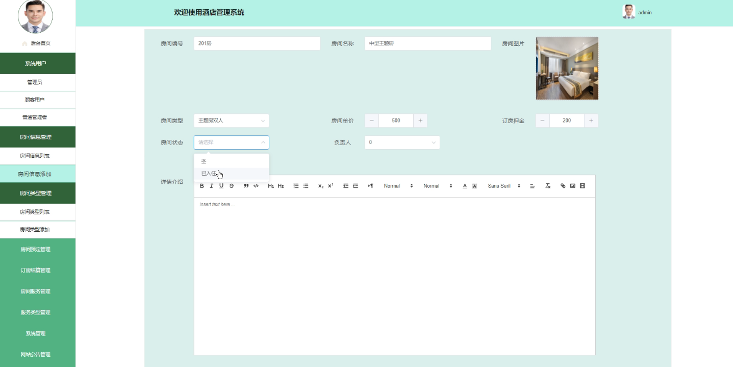 - 房间信息管理:提供添加、删除、查询房间信息的功能,管理员可以查看房间详情以及顾客的评论,确保信息的准确性和及时更新。