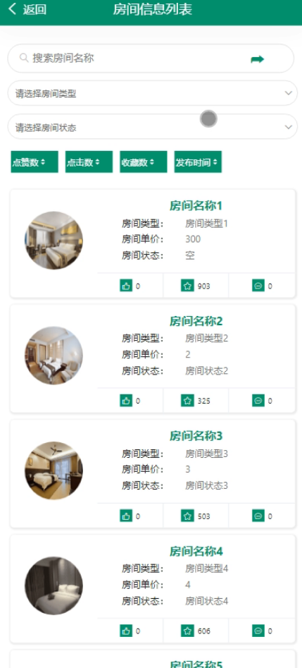 - 房间信息:房间信息页面提供了详细的房间介绍,包括房间图片、设施、价格和用户评价等。用户可以对房间进行点赞、收藏和评论,还可以直接进行预定。预定功能需要用户登录后才能使用。