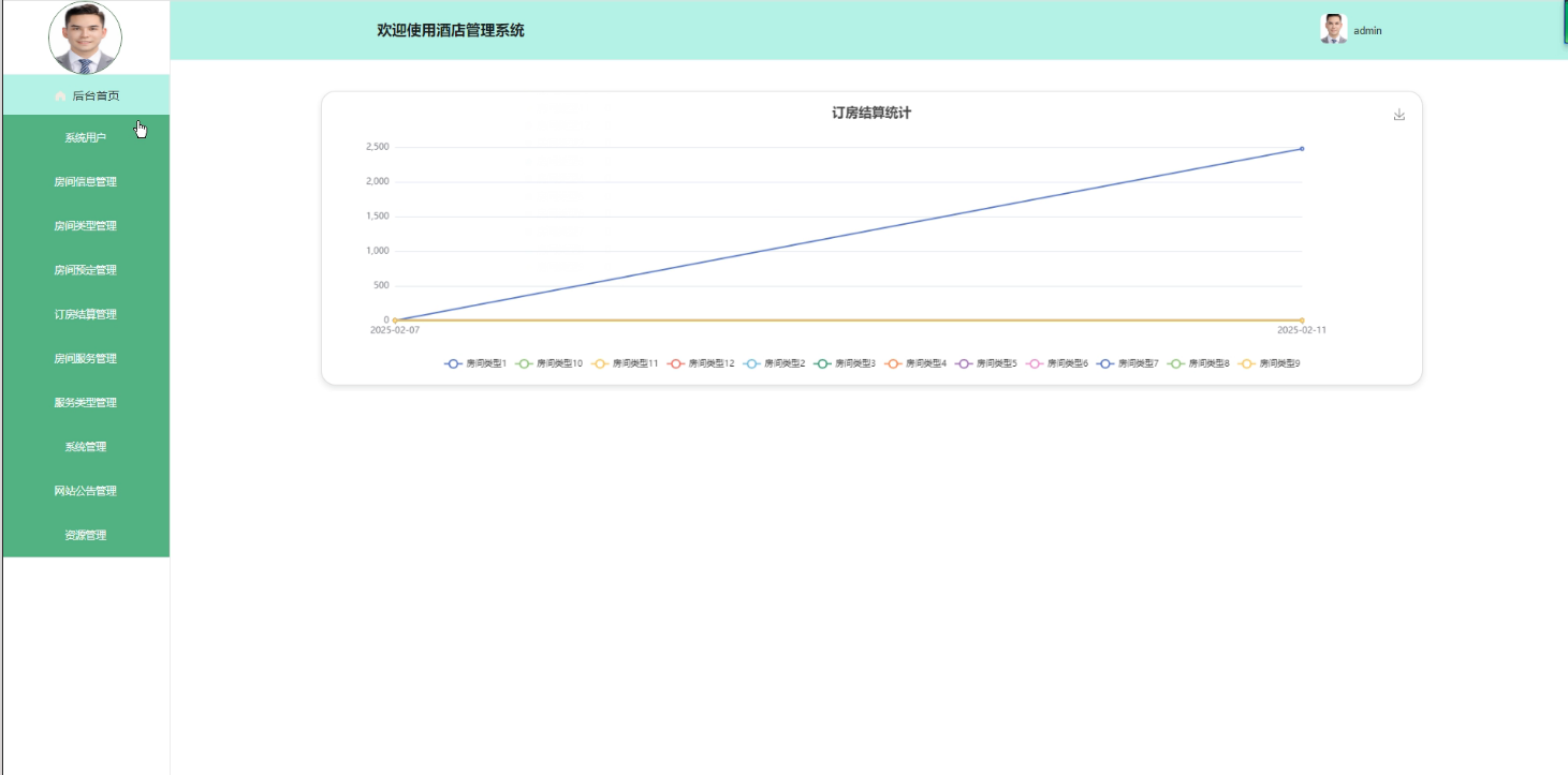 - 后台首页:展示订房结算统计信息,为管理员提供直观的数据概览,帮助其快速了解业务状况。