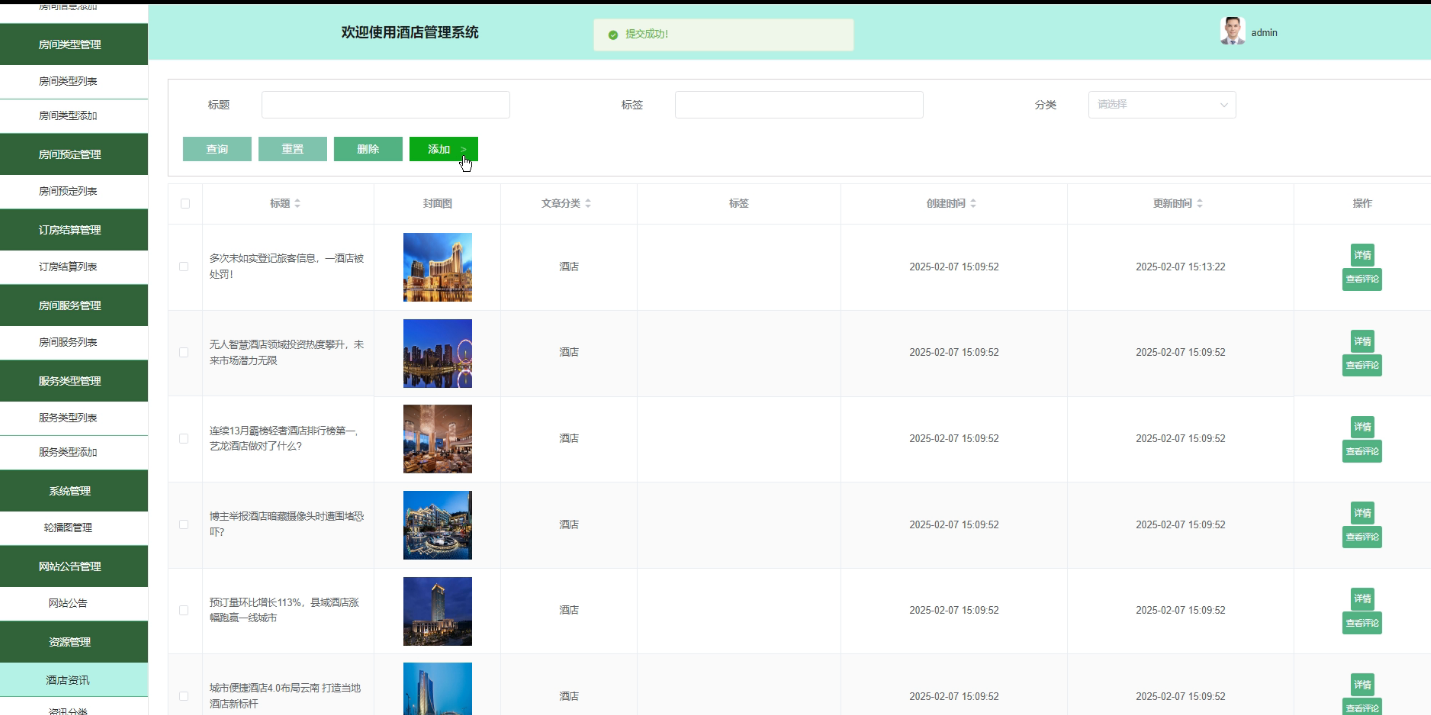 - 资源管理:涵盖酒店资讯和资讯分类的管理,包括添加删除查询功能,管理员可以更新资讯内容,并查看评论,确保信息的时效性和互动性。