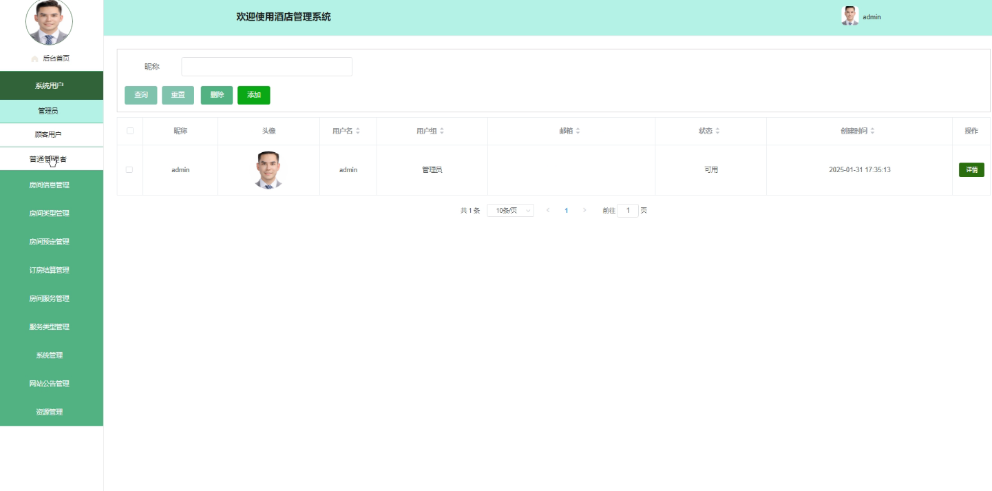 - 房间预定管理:普通管理员可以对房间预定进行管理,包括查询预定信息、查看预定详情以及审核预定请求。通过这些功能,管理员可以有效地处理房间预定事宜。