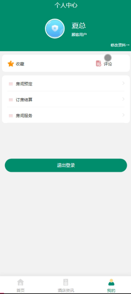 - 我的:“我的”模块是用户个人中心,用户可以在这里修改个人资料,查看和管理自己的收藏列表、评论以及房间预定记录。对于房间预定,用户需要等待管理员审核,只有审核通过后,用户才能享受房间服务,并进行订房结算。