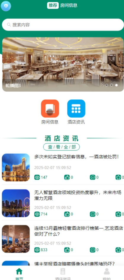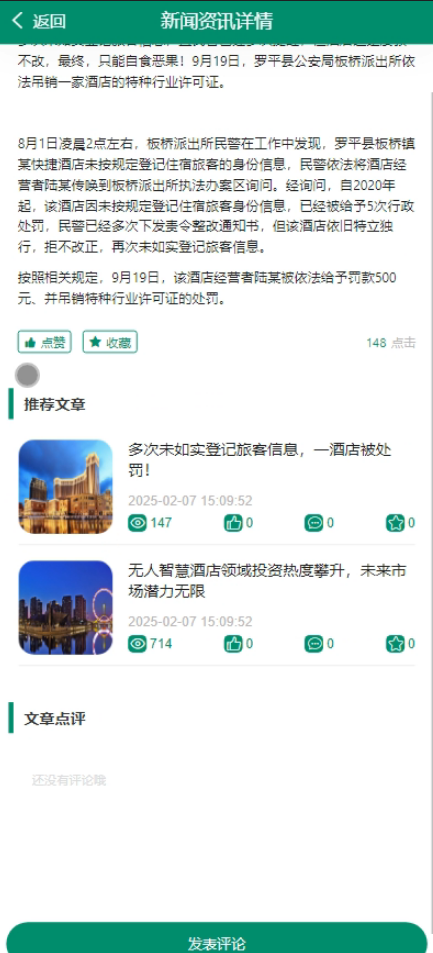 - 酒店资讯:酒店资讯模块允许用户查看酒店发布的文章和新闻,用户可以对感兴趣的内容进行点赞、收藏和评论。这有助于用户获取更多关于酒店的信息,同时也能与酒店进行互动。