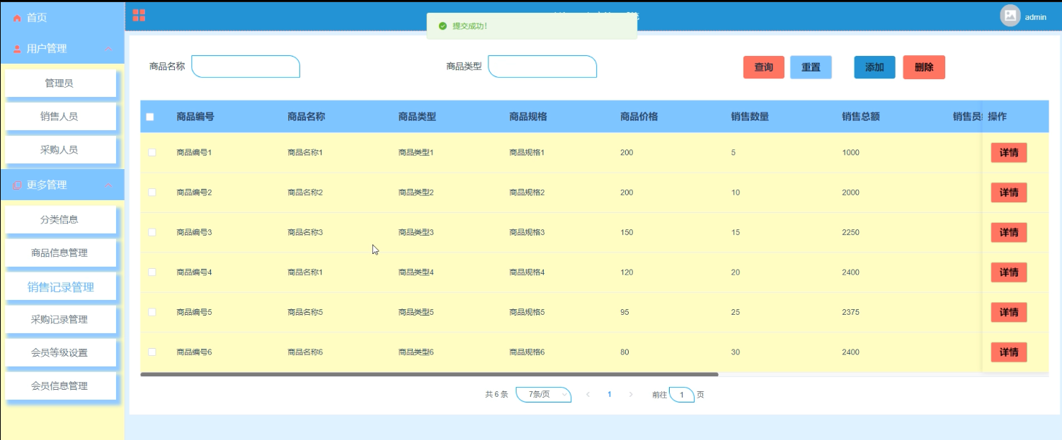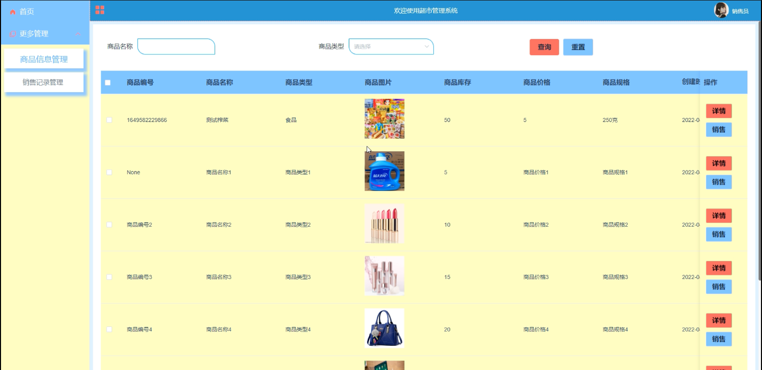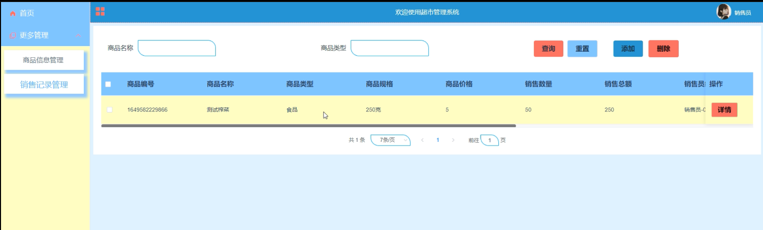 (5)销售记录管理:管理员可以对超市管理系统中现有的销售记录信息进行增删改查。