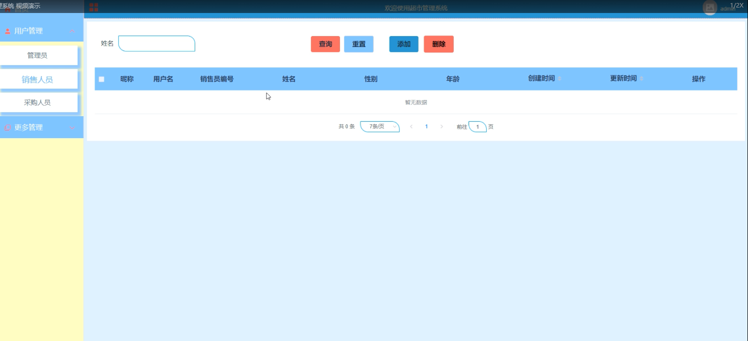 (2)系统用户管理:当点击“用户管理”这一菜单的时候,会出现管理员+采购人员+销售人员三个子菜单,可以对这三个模块进行增删改查操作;