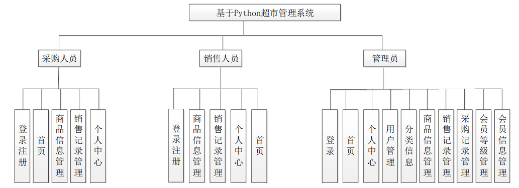 按照基于Python的 超市管理系统的角色,我划分为了销售人员管理模块、采购人员管理模块和管理员管理模块这三大部分。