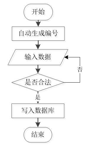 用户成功登入系统后就能够实现增加数据的操作,增加数据的编号是特定的,系统生成,用户不能随意填写,除了编号以外,其他增加信息用户自己填写,填写后的信息经过系统验证,验证合法通过就显示增加数据成功了,相反的话,就没有增加成功,图2-1显示的就是在增加数据时的流程。