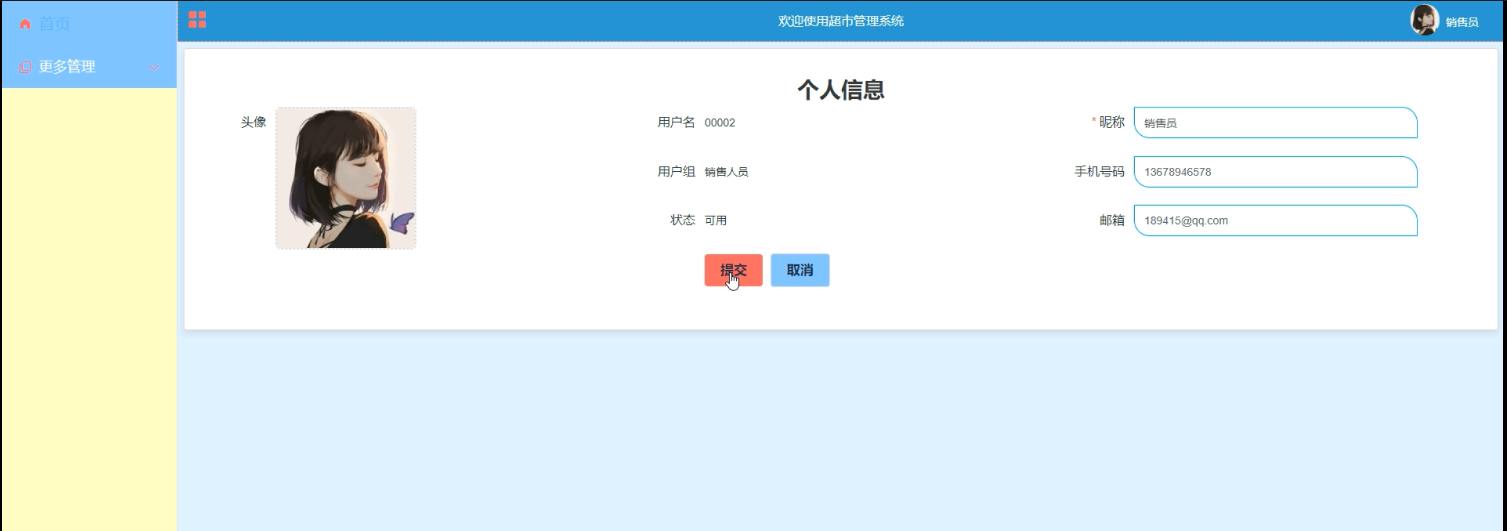 销售人员进入后台后点击“个人信息”,能够看到自己要修改个人信息,对个人信息进行管控。界面如下图4-3所示。