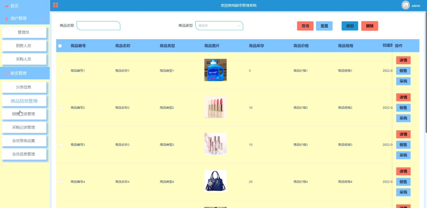 (4)商品信息管理:管理员可以对超市管理系统中现有的商品信息进行增删改查。