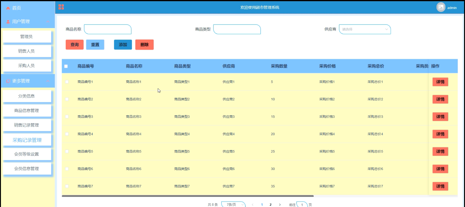 The supermarket management system uses Python language, uses Django technology based on MVC mode for development, and uses Python compiler. In terms of data, it mainly uses Microsoft's MySQL relational database as the data storage medium, and completes the development of the system with the foreground HTML + CSS technology.