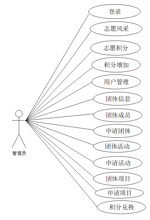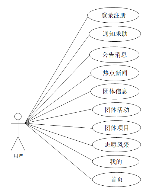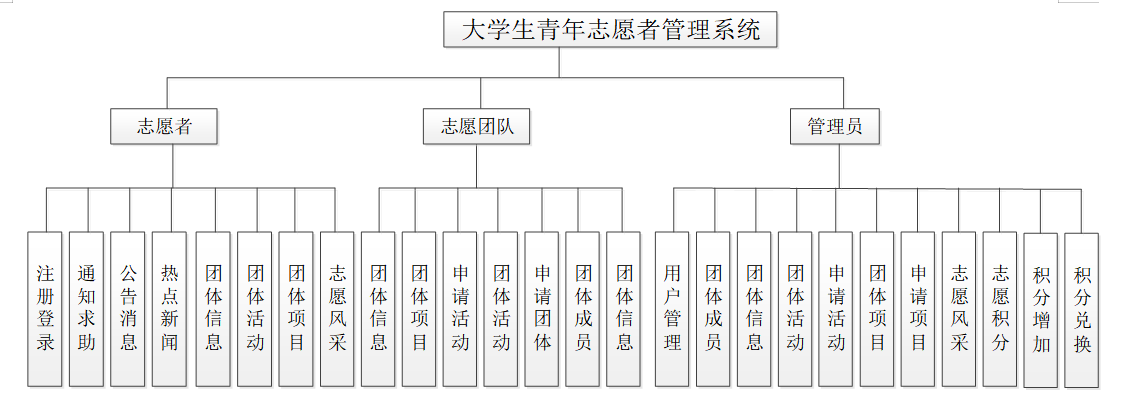 大学生青年志愿者管理系统的功能主要分为前台用户根据自己的需求进行注册登录,浏览志愿活动信息并对选中的志愿活动进行报名操作。后台系统管理员因职责的不同,分为普通管理员和超级管理员,管理员主要对用户管理、团体信息、团体成员、申请团体、团体活动、申请活动、团体项目、申请项目、积分兑换、志愿积分、积分增加、志愿风采进行处理。