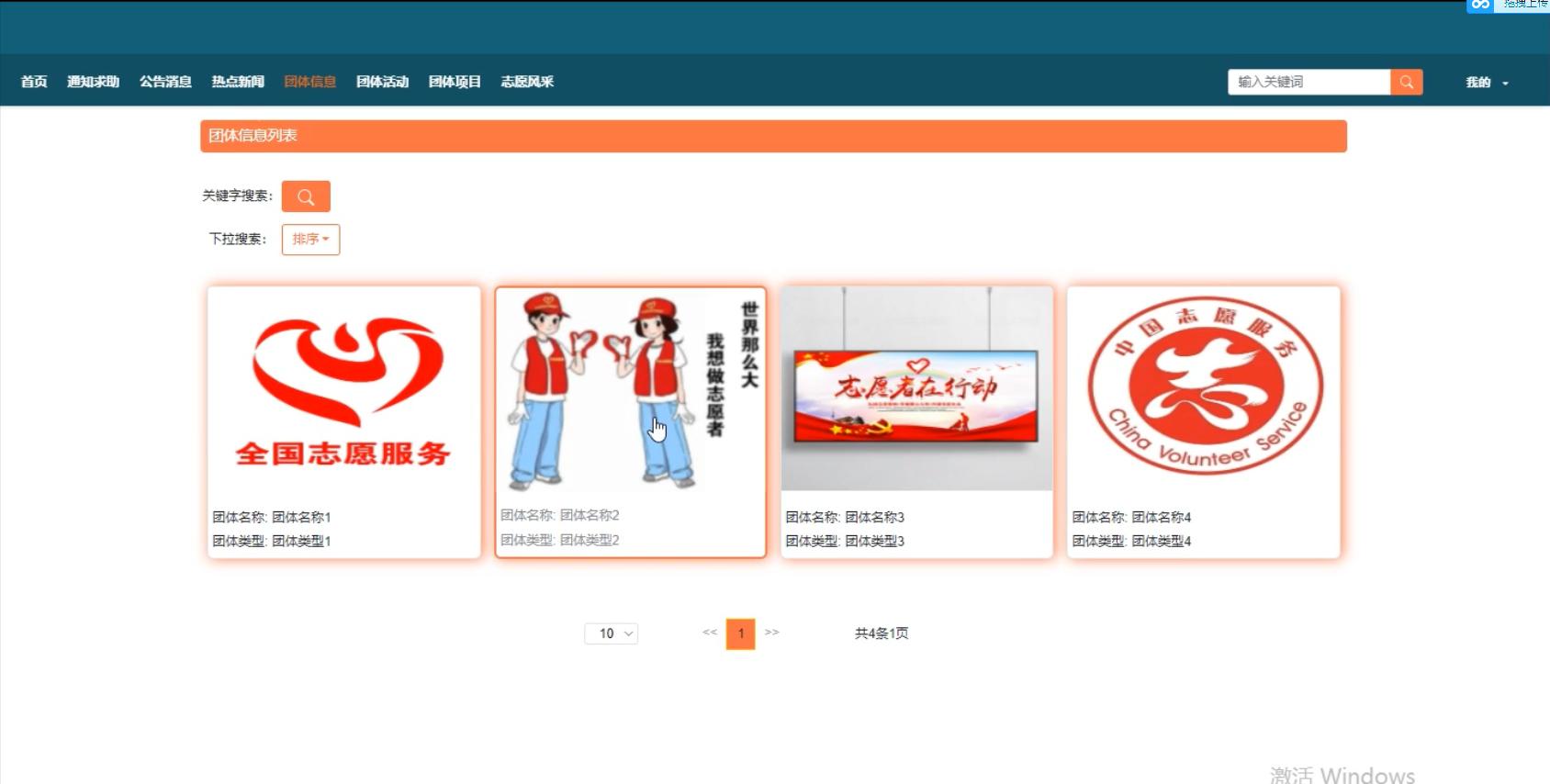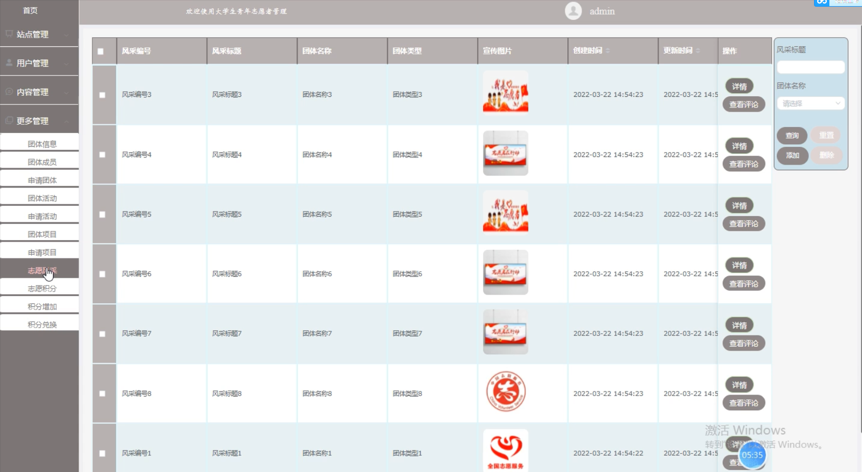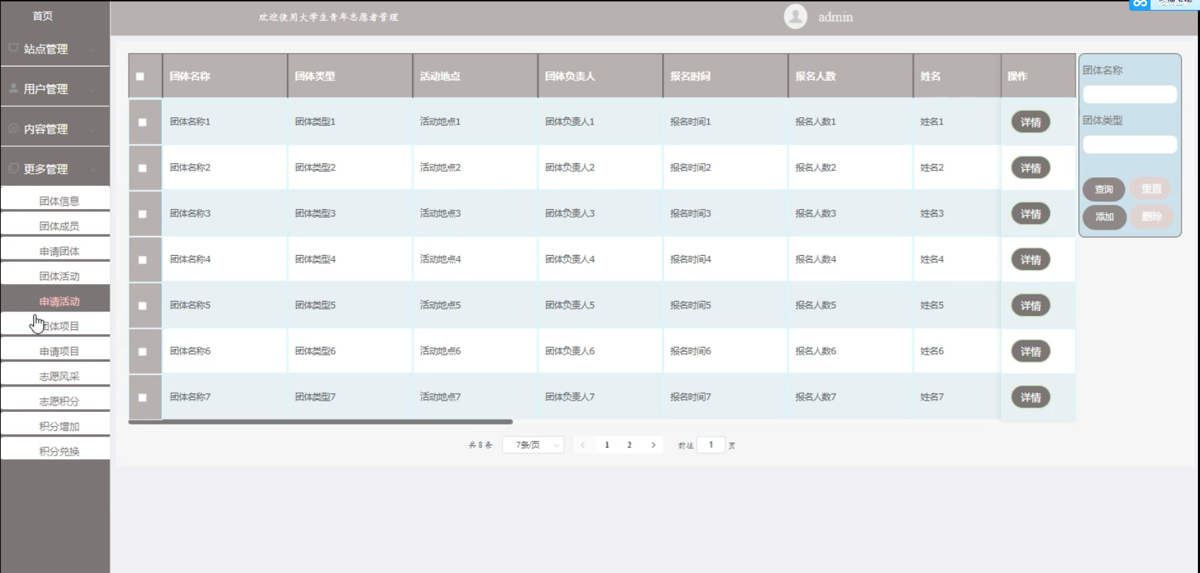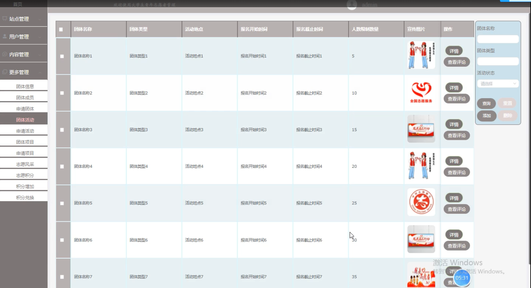 团体活动信息管理:对志愿活动信息进行维护,添加、删除、修改信息。