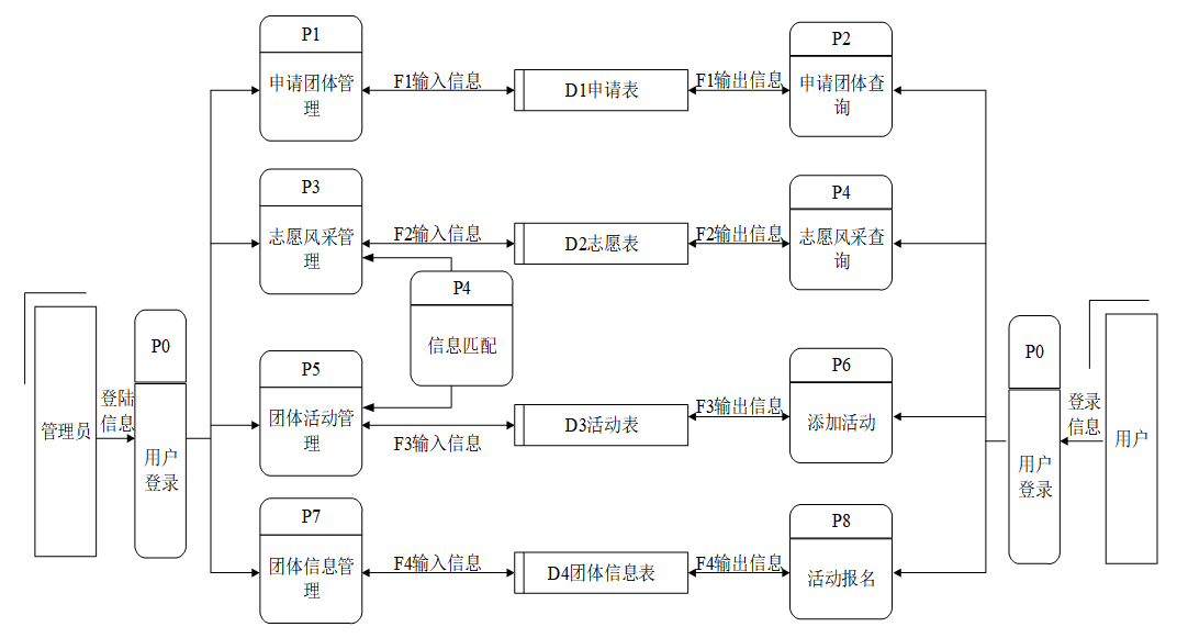 大学生青年志愿者管理系统总体分为前台用户模块和后台管理员模块。