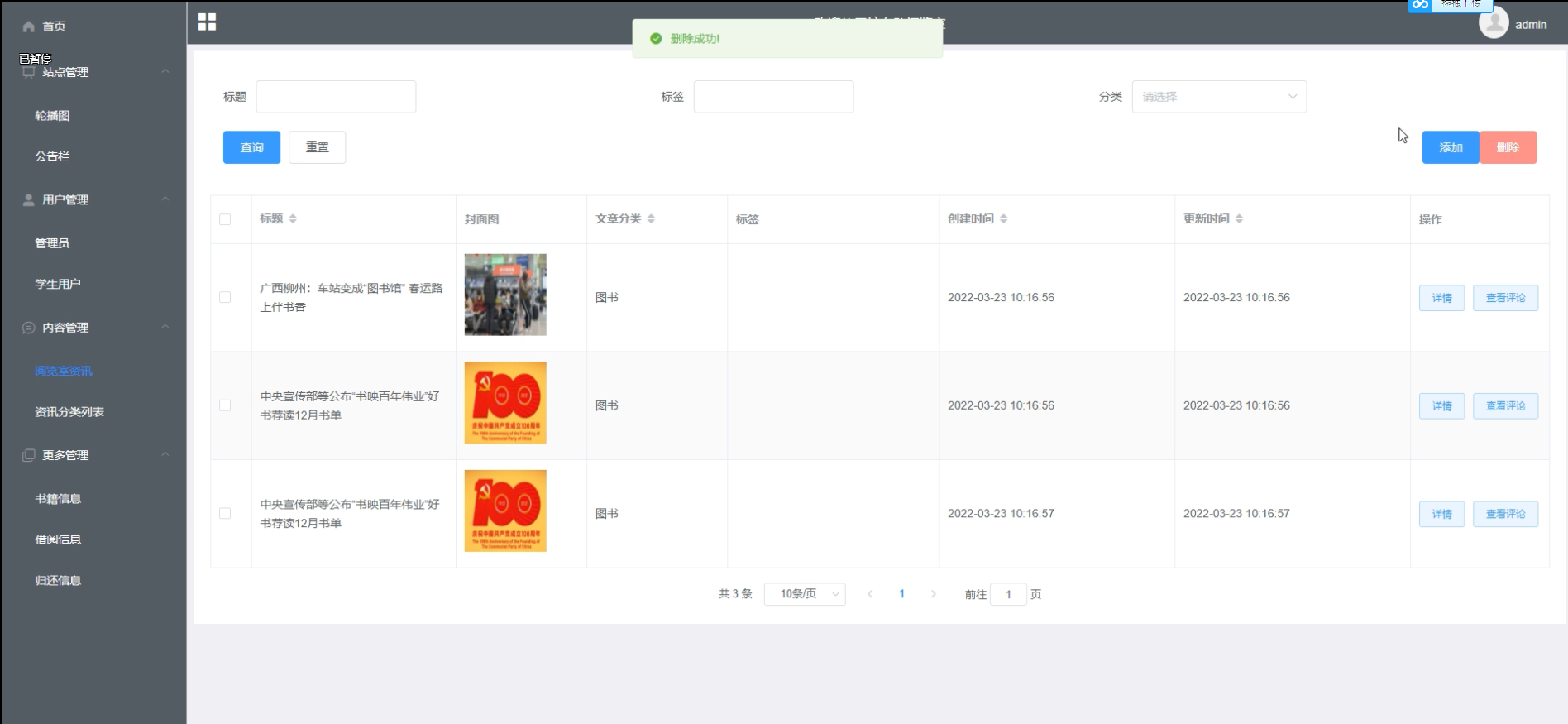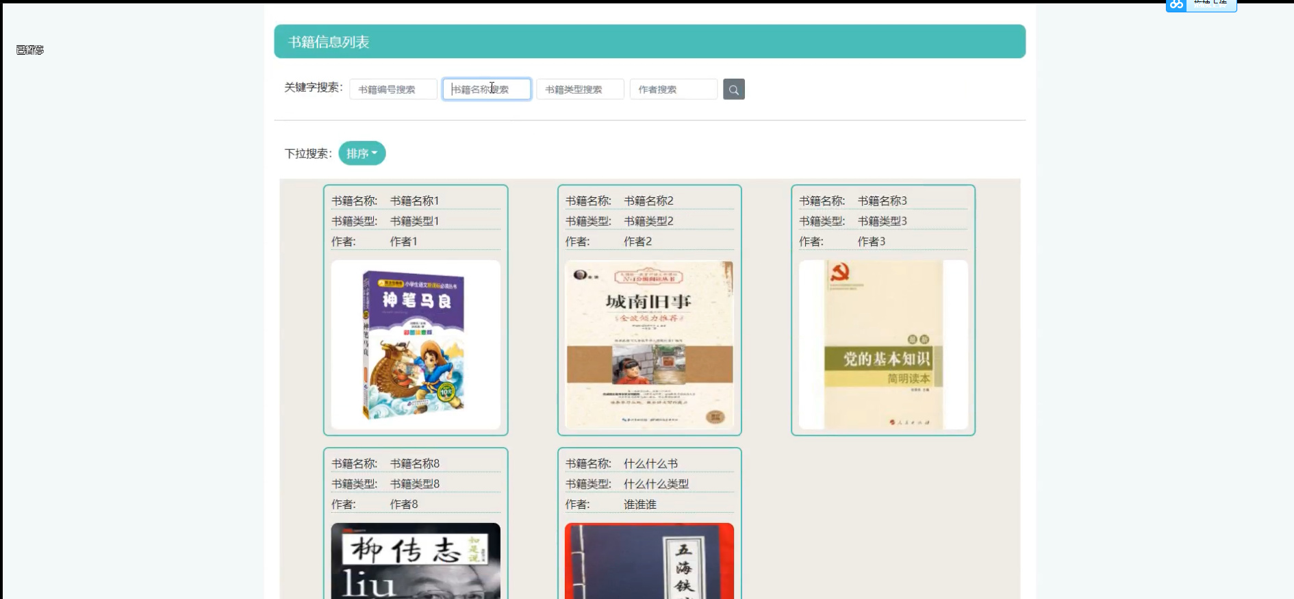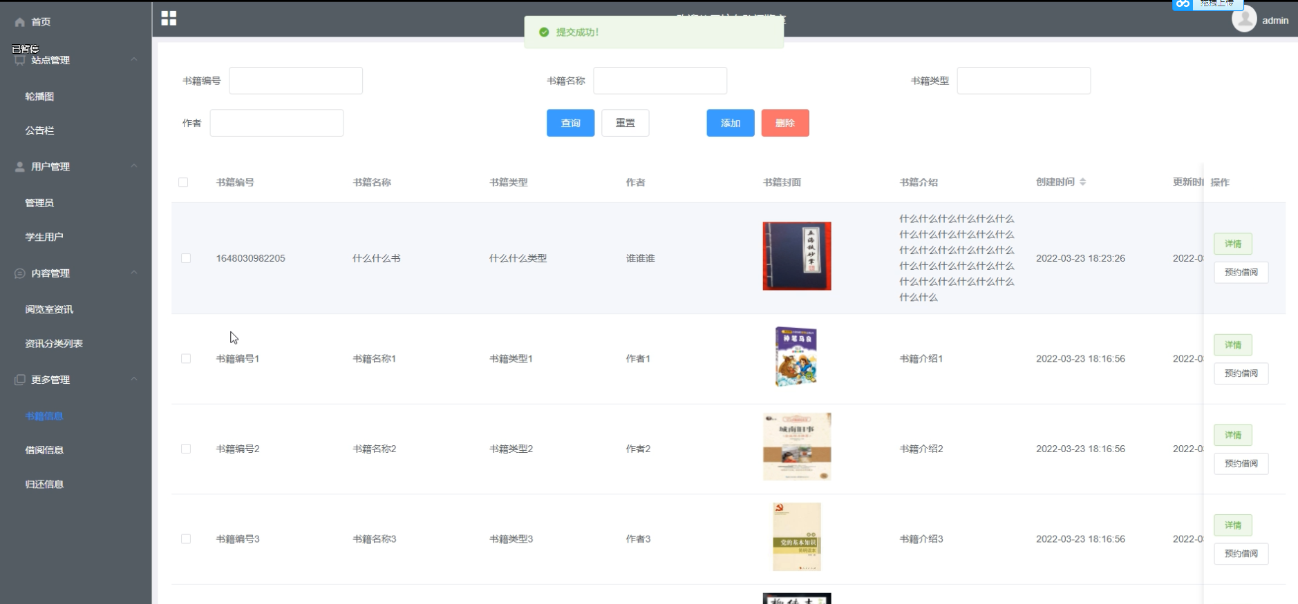 书籍信息管理信息展示,管理员通过查询书籍编号、书籍名称、书籍类型、作者、书籍封面、书籍介绍等详情信息、预约借阅,并可根据需要进行查询、添加、修改或删除操作,如图5-9所示