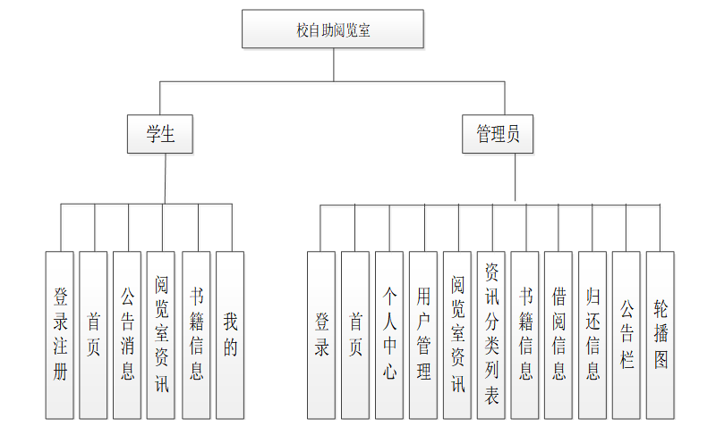 这些功能可以充分满足校自助阅览室的需求。此系统功能较为全面如下图系统功能结构如图4-5所示。